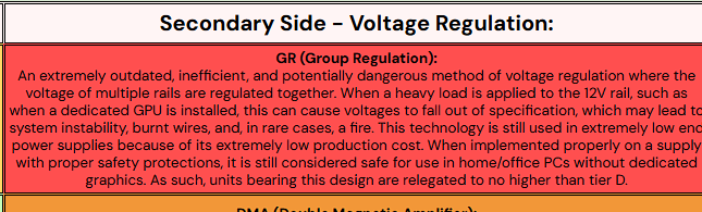 Eficiência aqui não no sentido de conversão energética, mas sim de eficiência prática e qualidade de projeto da própria fonte. Fontes com regulação em grupo (GR) são cronicamente inferiores nesse aspecto. Mesmo quando estão bem dimensionadas em potência, a maioria delas acaba ficando em tiers mais baixos em classificações como a do Cultists. Isso acontece porque são raríssimos os modelos GR que conseguem atingir Tier C ou superior, já que um dos critérios considerados é a regulação independente de todas as linhas, algo que o design em group regulation não oferece. Fonte: Cultist Tier List Como pode ver acima, fontes tier B tem de ser ao menos DC-DC. E em listas mais recentes (mais atualizadas), fontes GR sequer passam do tier D. Fonte: SPL tier list Vídeo da construcao interna das mach1 (capacitores chengx) E sim, a zillion possui analise no cybernetics. Cybenetics Test - Super Flower Zillion 650W -