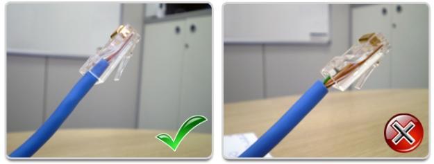 Caro colega como dizemos no popular "Bebe novo também morre" ou seja o cabo pode estar com defeito e pela imagem que você postou me parece que não foi muito bem montado e além disto você pode pegar um outro cabo e testar só para garantir. O técnico olhou a configuração da sua placa de rede ? Ele fez o teste de velocidade com equipamento dele para te provar que esta chegando a velocidade contratada ? Olhe a imagem que postei e compare com o cabo que o seu colega montou A imagem mostra a forma correta de montar o cabo. Pelo que vi na imagem que você postou me parece que ele tentou usar o padrão 568B começando do Laranja/Branco em diante mas procure na internet e veja se realmente segue o padrão que ele montou pode ser 568A ou 568B. -