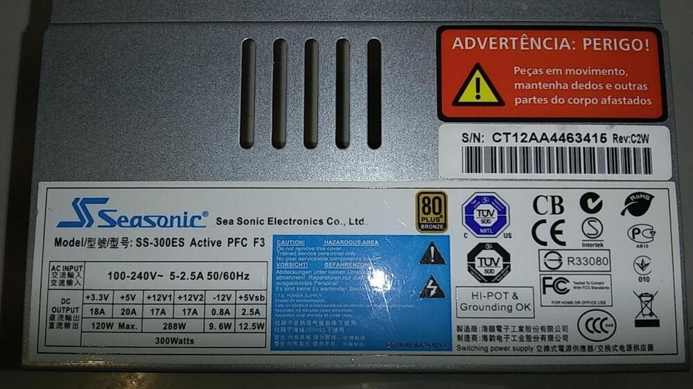 Boa noite, desculpem a exumação do tópico, podem me dar a pá de ouro! rs Respondendo a pergunta do colega no início do tópico, essa fonte parece ser boa sim, tenho uma que consegui junto com um material de informática que ia para sucata. Entendo um pouco de eletrônica e venho a um tempo, estudando aqui no fórum sobre fontes chaveadas de PC. A SS-300ES, tem uma boa filtragem na entrada da tensão da tomada, parece uma fonte parruda, em relação as genéricas que tenho aqui, TFC ativo, selo 80 Bronze, o circuíto é muito parecido com essa TFX que foi testada aqui no fórum. Usei por algum tempo funcionando sem nenhum problema, num PC com uma placa-mãe ECS G-41T-M7, com 4 GB de RAM DDR3, processador Core 2 Duo E8400, HD de 500GB, mas quando mudei a configuração para uma placa-mãe ECS G31T-M7, com 4 GB de RAM DDR2, processador também Core 2 Duo E8400, mas com 2 HDs de 500 GB e placa de Vídeo AMD Radeon HD5450 de somente 512MB DDR3, essa fonte depois de uns dias de uso, começou a resetar o pc. Até achei que fosse a placa-mãe, mas resolvi trocar a fonte por uma genérica de 350W, que eu tinha aqui em casa e parou de resetar. Também fiz um teste colocando essa fonte Seasonic, em um PC com placa-mãe Intel DH55TC, com 8 GB de RAM DDR3, processador i5-650, placa de vídeo GForce 210 1GB, DDR3, 1 HD de 500 GB e outra de 320 GB, também começou a resetar o pc, depois de uns dias de uso. Nesse PC i5, agora instalei uma Corsair CV450W, nova, nem preciso falar mais nada! Acredito que estes desarmes da fonte, possa ser o que o colega Phynsx postou, sobre um problema de aquecimento e achei o cooler pequeno (80mm) para a quantidade de componentes e o tamanho dos dissipadores que ela tem. O hold-up capacitor, pelo que entendi, é aquele capacitor eletrolítico do dobrador de tensão, no primário, que informa no corpo dele, a temperatura de trabalho de 85ºC, onde normalmente é usado capacitor de 105ºC. Acho que vou substituir esse capacitor. Será que é possível, instalar o hardware dessa fonte Seasonic, em um gabinete dessas fontes novas, que tem o cooler em cima, de 120mm? Tenho aqui uma Aerocool VX-350, que não funciona e inclusive se eu conseguir, trocar até a etiqueta para não ter uma fonte com informação errada. Abraços