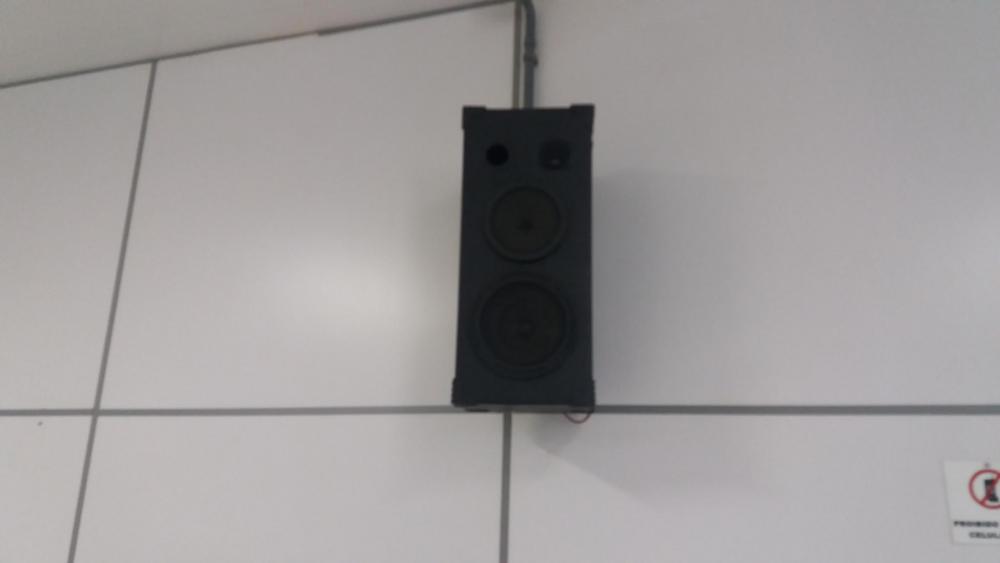Para ser sincero, hoje não esta nem funcionando, deve ser algum problema de cabeamento ou o amplificador com defeito, não consegui fazer sair nenhum audio das caixas. Mas quando ele ainda funcionava, sempre tivemos problemas com ruidos e baixa qualidade de áudio. Coloquei algumas imagens do equipamento que temos hoje e do ambiente. Eu acredito que tanto o amplificador quanto as caixas de som tenham mais de 10 anos... -