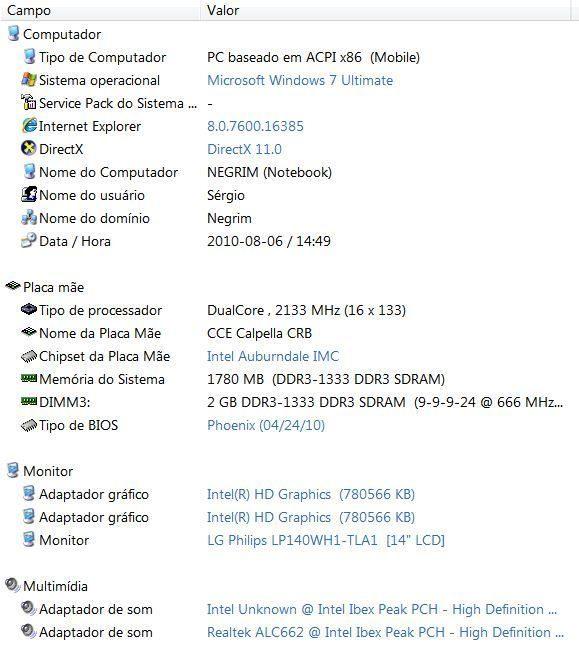 12. Olá pessoal!! Tenho acompanhado o tópico desde o início; Antes de postar aqui minha opnião sobre o T25L, primeiro tive que esperar para não dizer algo que pudesse me arrepender depois. Esse é meu segundo note e estou muito satisfeito em ter adquirido um produto que me surpriendeu em todos os aspectos. Não jogo, portanto, não me interessei no seu desempenho com jogos. Tentei, minuciosamente, ficar atento em todos os relatos quanto a problemas com seus equipamentos e, de todos nenhum deles observei no meu, somente um não relatado aqui nesse tópico referente ao T25L, é que ao ligar ou reiniciar o note com o adaptador wireless do mouse(Bright) conectado em uma das portas USB, a tela não acende. A configuração mostrada pelo Evereste difere com a do poste inicial.