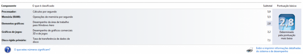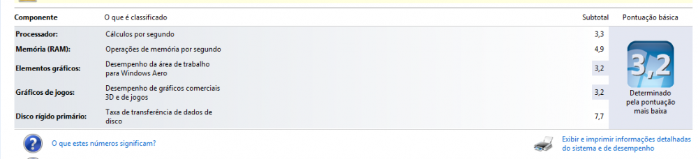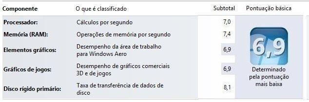 2. A nota do gráfico de jogos alterou várias vezes com atualizações da nvidia. A nota da memória não melhorou muito com relação a ter antes um pente só da smart, agora esta com dois pentes da corsair de 1333. O Hd é um plextor M5, 256 GB, sata 3, terceiro melhor na tabela que pesquisei; segue link: http://adrenaline.uol.com.br/forum/armazenamento/423349-topico-oficial-ssd-tabela-de-comparacao-entre-ssds.html A nota do primeiro hd que usei, foi um Crucial de 64 GB, tem nota 7,7 (acho) ligado com sata 2 do Acer 1410. -Este hd ganhou nota 7,9 no notebook Acer Core i3. O outro hd, um vertez 3, de 128 GB, tem nota 7,1 no computador Core 2 Duo, ligado em sata 2. -Este hd ganhou nota 7,9 no notebook Core i5. Atualmente o Notebook Core i3, com 8Gb Kingston 1333 tem nota 7,3 e usa um Hd Hibrido Seagte de 1Tb e 8Gb SSD; não lembro a nota, mas acho que ficou em 5,9, mas na prática é muito melhor e mais rápido que os comuns. Depois de usar ssd em qualquer equipamento, o resto vira uma ***** pra qualquer coisa. A nota do gráfico de jogos alterou várias vezes com atualizações da nvidia. A nota da memória não melhorou muito com relação a ter antes um pente só da smart, agora esta com dois pentes da corsair de 1333. O Hd é um plextor M5, 256 GB, sata 3, terceiro melhor na tabela que pesquisei; segue link: http://adrenaline.uol.com.br/forum/armazenamento/423349-topico-oficial-ssd-tabela-de-comparacao-entre-ssds.html A nota do primeiro hd que usei, foi um Crucial de 64 GB, tem nota 7,7 (acho) ligado com sata 2 do Acer 1410. -Este hd ganhou nota 7,9 no notebook Acer Core i3. O outro hd, um vertez 3, de 128 GB, tem nota 7,1 no computador Core 2 Duo, ligado em sata 2. -Este hd ganhou nota 7,9 no notebook Core i5. Atualmente o Notebook Core i3, com 8Gb Kingston 1333 tem nota 7,3 e usa um Hd Hibrido Seagte de 1Tb e 8Gb SSD; não lembro a nota, mas acho que ficou em 5,9, mas na prática é muito melhor e mais rápido que os comuns. Depois de usar ssd em qualquer equipamento, o resto vira uma ***** pra qualquer coisa.