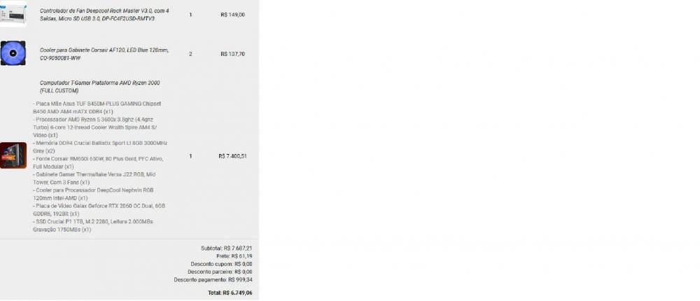 Então, pessoal. Bump pra informar o pessoal de que fechei a compra do PC com a Terabyte. E só pra mencionar: levei o 3600X a "contragosto": esgotou pela SEGUNDA VEZ em menos de uma semana o 3600 "low", então tive que me conformar pegando o 3600X, antes que ele também esgotasse (na verdade, na sexta também estava esgotado...). Muito obrigado MESMO a todos que contribuíram. A ajuda de vocês foi fundamental para me orientar nas minhas escolhas. Grande abraço a todos! A configuração e o preço final ficaram assim: -