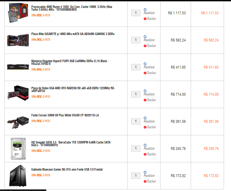 @andros santos obrigado pela ajuda montei esse aqui na pichau, ja vem montado amd ryzen 5 3600 hexa-core 3.6ghz (4.2ghz turbo) 35mb cache am4, asus prime b450m-gaming/br memória crucial ballistix sport 16gb (2x8) ddr4 2666mhz galax geforce gtx 1660 6gb gddr5 click oc 192-bit hd toshiba 1tb sata iii 3.5" 7200rpm, hdwd110xzsta corsair cx550 - 80plus bronze e pfc ativo gabinete pichau gaming magpie ii ssd wd green 240gb 2.5" sata iii 6gb/s ventoinha 120mm vermelho - 2 unidades ( incluso adaptador molex ) pasta termica deepcool z3, dp-tim-z3 filtro de linha clamper iclamper energia 5 tomadas total: r$ 4.259 a vista o que ? trocaria alguma coisa ou ta bom? -