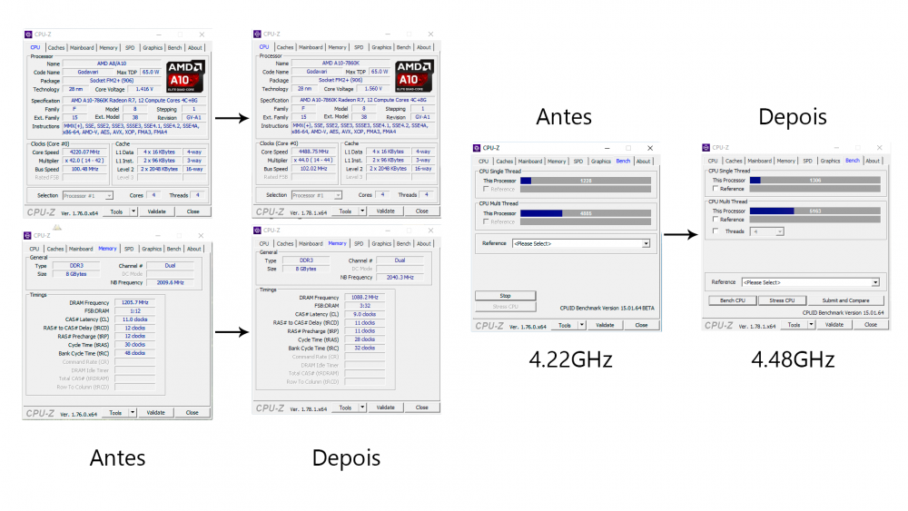 @lnpott Desculpe o abandono. Pois bem, comprei um cooler bacanudo e resolvi tentar ir um pouco mais longe. Este é o cooler novo: http://www.kabum.com.br/produto/40031/cooler-coolermaster-processador-amd-intel-hyper-t4-rr-t4-18pk-r1 E este foi o resultado obtido até o momento: Comparando com os resultados anteriores: A título de referência, segue abaixo a pontuação de alguns modelos em Stock e do 7860K com overclock: Intel Core i3 4150 3.5GHz [2C/4T] ----- 3304 AMD A10 7850K 3.7GHz [2M/4T] ------ 4413 AMD A10 7860K @4.22GHz [2M/4T] - 4885 AMD FX 8150 3.6GHz [4M/8T] --------- 5007 AMD A10 7860K @4.48GHz [2M/4T] - 5163 adicionado 15 minutos depois @Renato Gamer Amigo, peço desculpas pela demora. Provavelmente você já deve ter montado seu PC, mas, de qualquer forma, aqui vão meus pitacos sobre suas perguntas para registro do tópico. 1. Não considero um erro. Se tiver dinheiro, vá nele. Se não, vá de 7860K. Com um pouco de boa vontade ele até passa a performance do 7890K, mas este, por sua vez, provavelmente iria mais longe. 2. Ele é uma versão que roda nativamente numa frequencia maior, o que indica que, talvez, pudesse ir mais longe no overclock. 3. Ótimo. Já rodo muita coisa no gráfico integrado da APU. GTA V incluso. Com tudo no máximo, a 720p. 4. Eu realmente não tenho como dar certeza, mas se você não desabilitá-la no setup, creio que seja possível utilizá-la para algumas tarefas sim, como acontece com Notebooks com GPU dedicada + integrada.