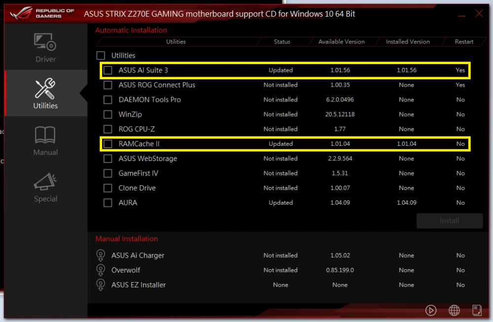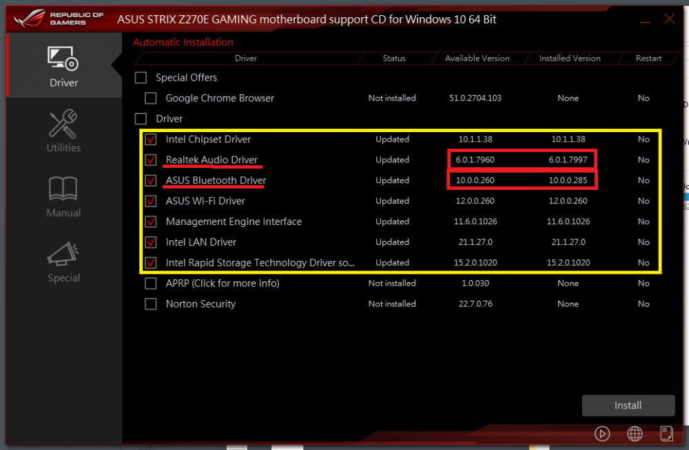 @renatomacedo Eu utilizei o CD da placa-mãe para instalar os seguintes drivers: Dai depois de instalar esses drivers (que o windows instala somente o driver genérico), instalei tb o Asus AI Suite 3 e o RAMCache II: Com a instalação do ASUS AI Suite 3, também foi instalado o EZ Update, que permite buscar updates dos drivers da ASUS diretamente. Dai foi através dele que eu fiz o update dos drivers de audio e bluetooth destacados em vermelho na imagem anterior.