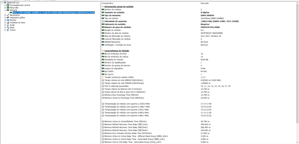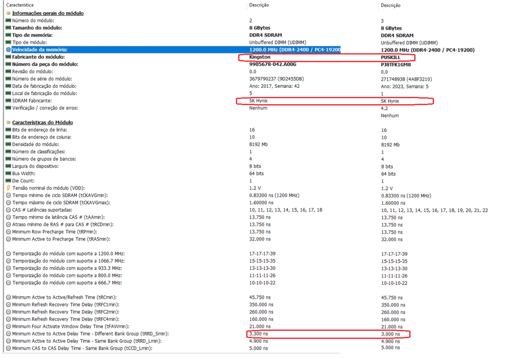 @Alexsandro Krzj @Alex Camus Só para vocês saberem. Comprei a memória da PUSKILL de 2400mhs e 8gb. Coloquei em Dual Channel com minha kingston. O sistema setou as latencias para 17-17-17-39 (que é o padrão da Kingston), diferente da 16-18-18-36 (que seria o da PUSKILL). Entretanto, fiz o teste de estabilidade do "Diagnóstico de memória do Windows", Memtest86 (completo) e Memtest64 (1 hora de teste), sem nenhum problema de erro ou estabilidade. Então parece que está tudo OK. Vocês sugerem mais algum teste? Além disso, comparei as configurações das memórias do Hwinfo64, e elas são extremamente parecidas. -