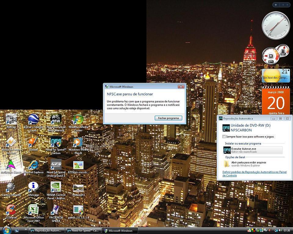 3. novamente o nfs carbon está apresentando problemas, dessa vez, quando tirei a ss, eu joguei 1 corrida rápida com um carro dos "Meus Carros" e ganhei, então fui jogar em outra corrida rápida, também com um carro personalizado por mim, e no meio da corrida, ele me trava, é sempre assim.Vale lembrar que uso o windows vista.Ah, nao pode ser aquele problema do nvddlmkm.sys, porque já corrigi o problema e o aviso de problema no driver não aparece.A versão do jogo é a 1.4, e a tradução do Game Vicio, está instalada. pro pessoal que for me ajudar, esse nao é o vista basic, é o premium Aqui está a ss: