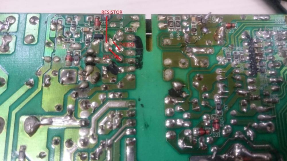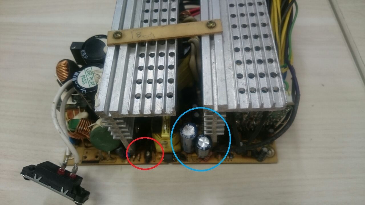 22. Estou consertando uma fonte C3 Tech modelo KMG 4050. Identifiquei 2 capacitores estufados (1000u x 10v e 2200u x 10v) e já os substituí (circulados em azul). Há um resistor "torrado" (círculo vermelho) e que não consigo identificar o valor dele. Como posso fazer para substituir? Obrigado.