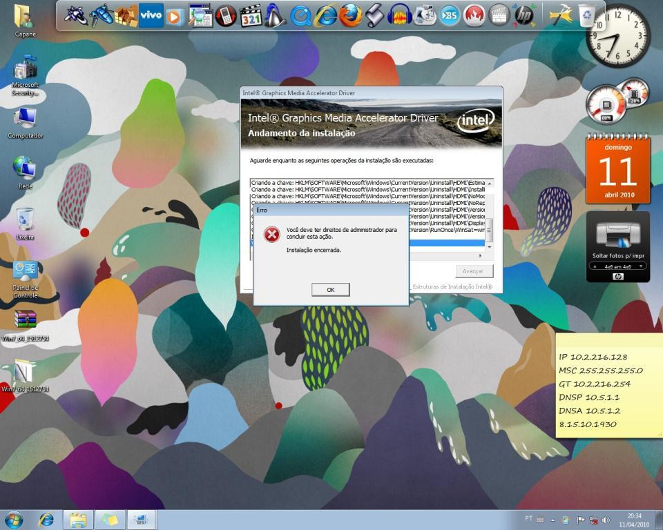 2. Sim o aplicativo para o driver é da intel. Mensagem: Você deve ter direitos de administrador para concluir esta ação e diz instalação encerrada. Segue a tela do erro.