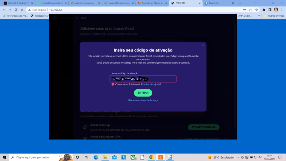 6. De uma hora para outra, quando entrei no site do Bradesco, inseri meus dados bancários para poder entra na minha conta. Depois de alguns minutos, veio a mensagem pedindo para "executar o diagnóstico de rede do Windows". Quando eu fiz isso, apareceu a mensagem de erro (vide anexo). Com o site da Avast, quando tentei inserir uma chave de código da assinatura, veio a mensagem dizendo para eu me conectar com a Internet (anexo). Com a maioria dos sites, não tenho esse problema. Com o auxílio da Microsoft tentei corrigir o erro, mas não consegui. Pesquisei no Google e também não. Meu sistema operacional é o Windows 10 e por causa desse problema, reinstalei o Windows do zero. Adivinhem o que aconteceu? - nada, o problema continuou.