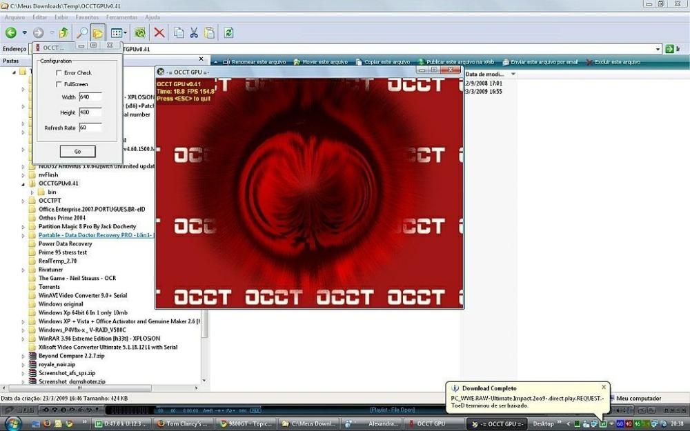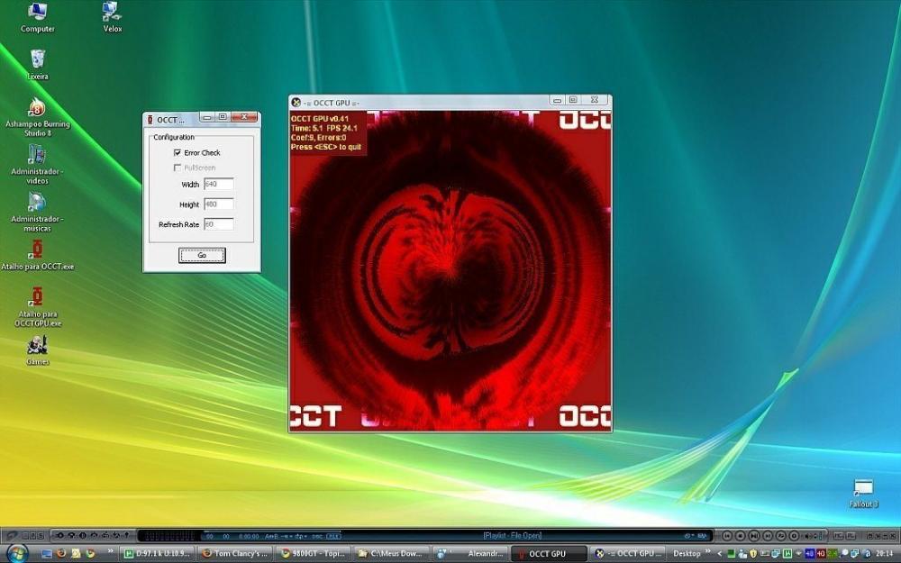 Bom, num sei qualé a desses erros não, mas parece q são artefatos.. tipo os q você teve.. esses testes fazem uma varredura em ambient 3D e procuram p. ex. um pixel q não devia estar lá, ou q não foi processado direito.. foi o q eu entendi e a galera de outros foruns usa esses programas também. Segue screen do OCCT GPU funcionando. Observe q tem q clicar em "Check for errors". Não sei se posso falar aqui mas costumo usar também um forum que tem um "topico oficial de screenshots" adr***line - se fizer essa busca no google, vai achar com ctza! Lá eles também fazem esses testes na parte d hardware. Aqui tem mostrado alguns erros após 11min no cubo peludo, mas ta parecendo q é por causa da temp.. nos jogos ta super normal! No OCCT GPU depois de 75° a placa de video começa a fazer "pausas" no processamento de imagens dae volta pra uns 63°.. deve ser algum outro componente que esteja abrindo o bico.. como essa placa roda TUDO no máximo na minha resolução, vou usar ela com esse pokinho de over.. até porque também acabei de comprar e fiquei sem grana.. mas ano que vem antes de trocar o monitor e a VGA, vou fazer um over mais agressivo.. Num vale a pena queimar a bichinha novinha pra ganhar desnecessários 4 frames.. EDIT: Se eu não clicar em "Check for errors", os fps ficam em 148~154.. segue screen e link pro OCCT GPU: http://www.ocbase.com/OpenBeta/OCCTGPUv0.41.zip To usando o driver 178.24.. achei ele mais estável