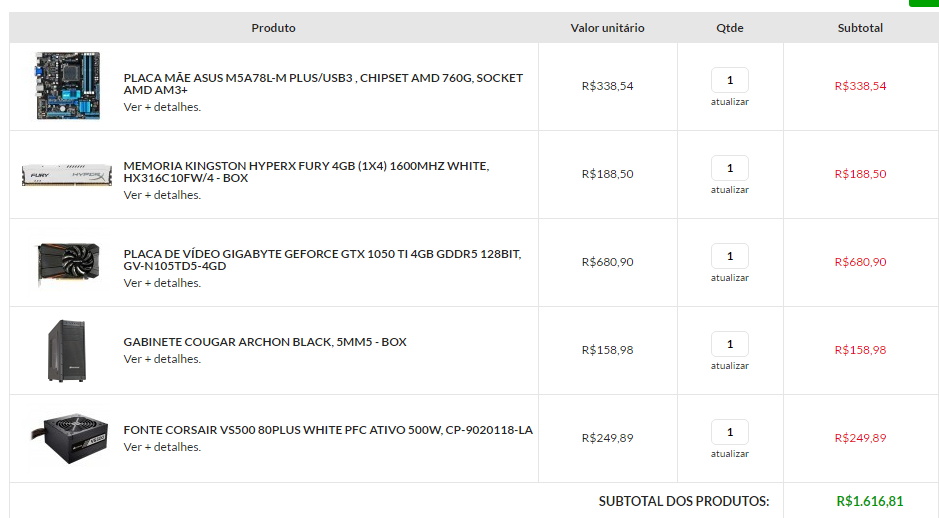@Kris Wannieg Bom o processador eu ja tenho FX 6300 e outra memoria de 4gb e os hd também o que eu necessito são esses componentes citados acima escolhi de acordo com o que eu posso paga pois acho 1700 o máximo no momento. -