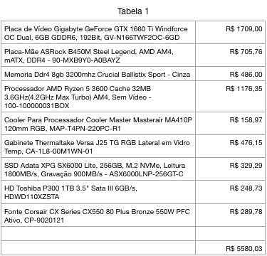 Beleza. Montei essa config abaixo na pichau (não encontrei alguns modelos específicos): Processador AMD Ryzen 5 3600 Hexa-Core 3.6GHz (4.2GHz Turbo) 35MB Cache AM4, 100-100000031BOX (R$1.079,42) Qtd: 1 Cooler para Processador Cooler Master Hyper T200, RR-T200-22PK-R1 (R$79,43) Qtd: 1 placa-mãe Asus Prime-B450M-GAMING/BR DDR4 Socket AM4 Chipset AMD B450 (R$517,05) Qtd: 1 Memoria Corsair Vengeance LPX 16GB (2x8) DDR4 3000MHz Preta, CMK16GX4M2B3000C15 (R$589,79) Qtd: 1 Placa de Video Galax GeForce RTX 2060 Super 8GB GDDR6 1-Click OC 265-bits, 26ISL6HP39SS (R$2.555,65) Qtd: 1 SSD Corsair Force LE200 120GB 2.5" TLC NAND Sata III, CSSD-F120GBLE200B (R$214,78) Qtd: 1 HD Toshiba P300 1TB 3.5" Sata III 6GB/s, HDWD110XZSTA (R$248,73) Qtd: 1 Gabinete Aerocool AERO 500 White Edition Window, EN55583 (R$241,93) Qtd: 1 Ventoinha Cooler Master MasterFan Pro 120 Air Flow RGB 120mm, MFY-F2DN-11NPC-R1 (R$67,04) Qtd: 1 Fonte Corsair CX Series CX550 80 Plus Bronze 550W PFC Ativo, CP-9020121 (R$329,44) Qtd: 1 Total: R$5.804,80 O valor ficou acima do que pretendo O valor é esse mesmo? Ou consigo encontrar mais em conta ou talvez trocando alguns componentes? -
