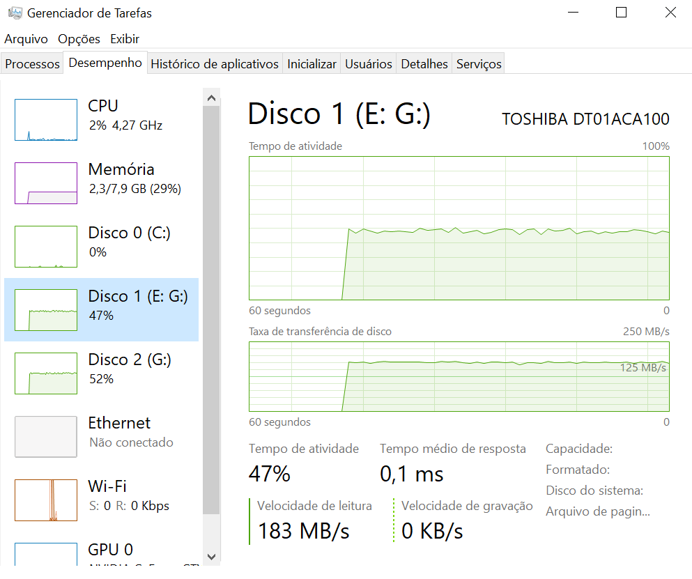 Pessoal, Problema bizarro aqui. Se atualizo meu Windows 10, os meus 2 HD's em raid 1 (espelho) vão a 100% de uso o tempo todo e depois de um tempo o PC trava. Problema é que se eu voltar pra versão original os drivers da Nvidia não funcionam com ela (problema já conhecido do público). Tenho 3 HD's. 1 SSD para o SO e outros 2 HD's em raid 1 para dados. E de brinde ainda, o mais estranho é que o Chrome não consegue abrir nada na net depois da atualização. Só o Edge. Vi na net (inclusive no site da Microsoft) algumas coisas que tentei e nada. Já configurei pra inicialização rodar apenas aplicativos Microsoft. Já retirei memória virtual... Já retirei do registro a inicialização do "Search". Até agora nada... Depois de fuçar um pouco, vi que há um ícone no gerenciamento de disco nos dois discos em RAID 1, conforme abaixo: Reparem que ele está sincronizando o RAID novamente após a atualização. Mas não sai desses 26%. Dá pra reparar também a exclamação nos discos, não sei o que é. O Windows não deixa desfazer o RAID pois diz que está sincronizando. Os discos estão íntegros, aliás, um deles não tem nem 1 mês. Abaixo a imagem do disco 0 (SSD com o SO). Não sei o que é esse despejo de memória. Se eu voltar pra versão antiga do Windows o problema para, porém daí não consigo instalar os drivers da placa de vídeo. Abaixo o "culpado" de tudo: As vezes oscila um pouco o uso dos discos. Na imagem acima estava em 50%, mas maior parte do tempo está em 100%. Alguém com uma luz? Obrigado e abraços!