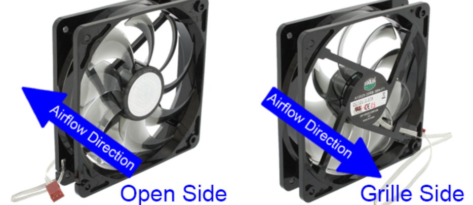 Quatro parafusos em local específico do gabinete para eles. Os da frente na posição para puxar o ar pra dentro do gabinete e o de trás para fora. Geralmente tem uma seta na lateral do fan indicando o sentido do fluxo de ar nele.