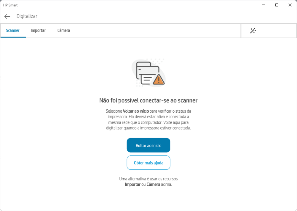 9. Possuo a impressora HP DeskJet Ink Advantage 2774 desde o final de 2021, e no ano passado fiz upgrade de computador partindo pra um com Windows 11. Vinha funcionando normalmente desde então, até eu escanear um documento ontem (comprei essencialmente para esse uso) dando este erro: A primeira conclusão que cheguei foi de ter sido algo com a conexão ao roteador, já que em novembro passado comprei um TP-Link para criar uma rede mesh. No entanto, antes de partir para a reconfiguração, resolvi fazer dois testes: 1- por um note que tenho em Windows 10 2- pelo app da HP no celular, já que é possível também comandar as operações da impressora remotamente Adivinha? Sim: em ambos funcionando normalmente, onde a conclusão é que por sabe-se lá a razão esse aplicativo se tornou incompatível ao Windows 11 ou só resolvendo em alguma atualização. Se mais alguém aqui passou por situação semelhante e resolveu, serei grato em saber qual foi o procedimento.