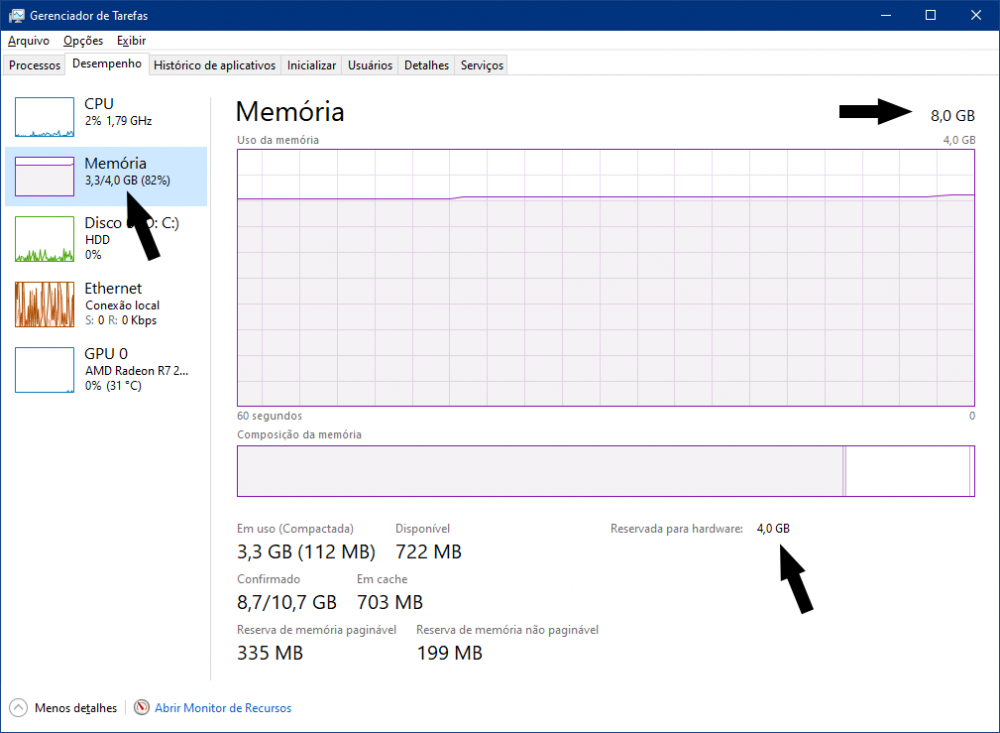 4. Antes de falar o problema todo, passo o setup do meu computador: Antes da atualização, eu lembro que esse valor mostrava algo próximo a 7,4GB-7,6GB, porém após atualização notei que está sendo exibido assim. Fiz a checagem padrão em outros locais para saber se de repente um dos pentes estava dando problema, porém continua detectando normalmente: Neste inclusive, antes da atualização, mostrava o 8GB Indo o MS Config ele também está sendo detectado normalmente (porém não confirmei para alterar, já que por padrão estava desmarcado): No entanto, o desempenho do computador caiu drasticamente onde o simples ato de abrir um navegador (qualquer um: Chrome, Firefox, Opera, Edge) está demorando além da conta. Minha dúvida: há algo a ser feito ou tenho infelizmente aguardar uma nova atualização da Microsoft? Como eu disse, antes da atualização tudo estava funcionando normalmente.
