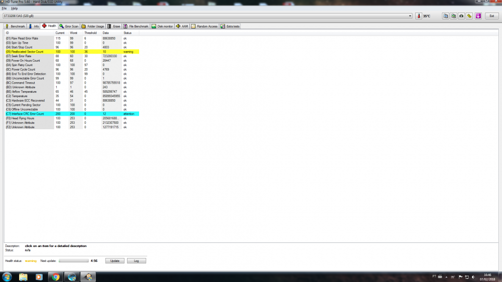 2. Boa tarde galera. Estou preocupado com a saúde de dois HDs meus, o primeiro modelo HD SEAGATE 320GB e o segundo HD SEAGATE 1TB. Por favor, quem puder dê uma olhada nas imagens abaixo e me diga uma opinião. Segue abaixo dois prints do programa CrystalDiskInfo e dois prints do programa HD Tune Pro.
