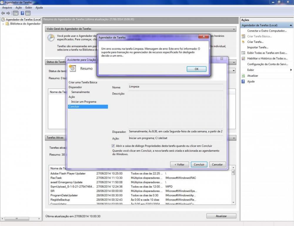 1. Bom dia pessoal. Estou com um problema que já está me perturbando. Estou tentando criar uma tarefa no Agendador de Tarefas do windows e tá dando um erro. Segue a imagem.