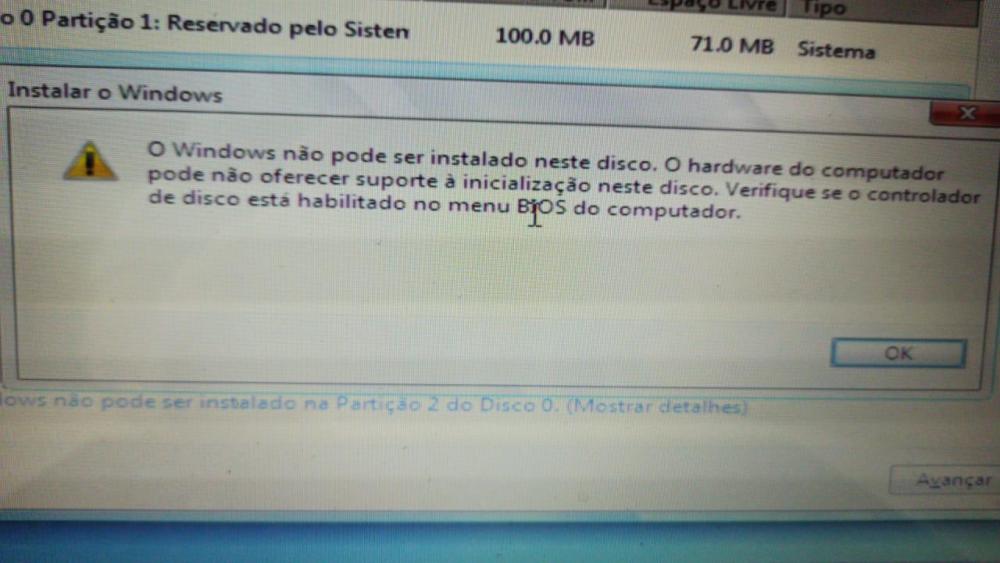 4. Opa; Um cliente trouxe pra mim um Laptop NP-R430-JAD1BR que estava lento, como de praxe realizei um teste de disco e o disco estaca cheio de Bad Blocks, então passei um orçamento de um ssd, pra dar uma vida maior pro Laptop, ja aproveitei que estava com ele e ia demorar chegar o SSD e realizei uma manutenção preventiva interna no Notebook, trocando pasta termica e tirando a poeira, quando chegou o ssd fui instalar ele, e pra minha surpresa o windows repotou uma mensagem: O windows não pode ser instalado nesta unidade. (mostrar detalhes). ai clicar nos detalhes: O windows não pode ser instalado neste disco. O hardware do computador pode não oferecer suporte à inicialização neste disco. Verifique se o controlador de disco está habilitado no menu de BIOS do computador. Ai fui eu correr ao pai dos burros (GOOGLE), e achei diversos procedimentos que fizeram pra isso parar de ocorrer, porém aqui nenhum dele funcionou, e ja virei a bios do avesso e não achei nada, segu lista dos procedimentos que ja realizei: -Tirei placa Wireless; -Limpeza das memórias; -Reset da Bios, tanto direto pela bios quanto remoção da bateria interna; -Alteração de diversas configurações da Bios; -Tentei instalação com 2 dvds diferentes do windows 7, um pendrive do windows 7 e um do 10 e o erro é o mesmo. Entrei em contato com o suporte da Samsung e me informaram que precisava levar a uma assistencia autorizada, que fora isso não teria o que fazer, trabalho a mais de 13 anos em manutenção de notebooks, desktops e servidores e até hj não vi nada se quer parecido; Se alguem tiver uma ajuda pra mim, agradeceria.