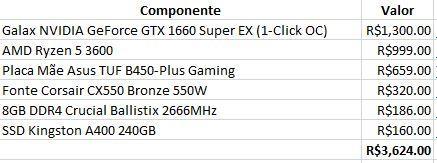 Boa noite pessoal do CDH. Seguinte, essa quarentena está ressuscitando meu sonho de comprar um PC bom que tenho faz anos. No começo do ano eu tinha feito um orçamento, mas abandonei pois os preços estavam subindo muito. Gostaria de uma recomendação até R$ 3500 (+/- R$200). Tenho preferência por AMD Ryzen e GTX 1660 Super. Abaixo é um orçamento que fiz no dia 24/12/2019 na Kabum, onde os preços não estavam tão altos ainda. Isso sem contar o gabinete. Mouse já possuo um G403 e um teclado velho, então preciso de um monitor (que pode ser comprado parcelado no crédito). Nesse valor, o que acham de um R5 1600 AF + 1660 Super + 8gb ram (inicialmente, depois colocaria mais 8gb) e uma placa-mãe b450m? Valeria a pena, se no futuro eu querer fazer um upgrade pro R5 3600, ou até a 4ª geração que já vi falarem que vai ter compatibilidade.. Quem sabe trocar até a VGA. Sobre a VGA, olhei bastante a asus tuf3 e placa-mãe a asus tuf e asrock steel legend (atualmente está bem cara também) Objetivo: rodar jogos atuais em Full HD(Resident Evil remakes, Sekiro, Shadow of Tomb Raider, GTA V, RDR2, Borderlands 3, Dark Souls II, etc.) E também utilizar para trabalho, onde uso bastante software de engenharia, excel, etc com bastante multitask (sou engenheiro civil e professor. Nessa quarentena, tá rolando aula online com espelhamento de tela e tudo mais rsrs). Minha config atual é um notebook de 2013 com um i7 3610qm + GT630M, que tá sofrendo pra continuar rodando um dotinha. Iria deixar o notebook só para dar aula e armazenamento. Desde já obrigado a todos pela atenção Grande abraço e se cuidem. Detalhe: no verão eu sofro, pois meu quarto é muito quente e só possuo ventilador.