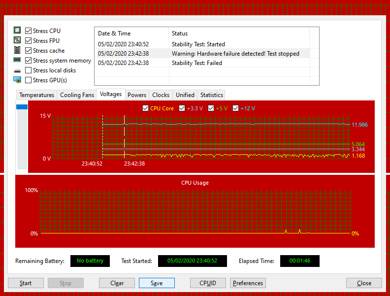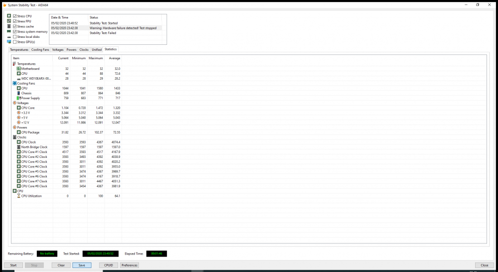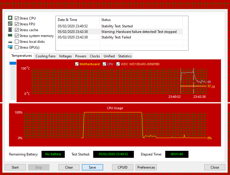 Fui rodar um stress test do AIDA 64 a titulo de curiosidade e pra minha surpresa em menos de 1 minuto ele interrompe o teste com a seguinte mensagem: Warning: Hardware Failure Detected! Test stopped, mas não sei interpretar corretamente este teste, gostaria muito que me ajudassem, reparei que assim que inicia o teste a temperatura do processador sobe de 40Graus para 86 isso muito rápido mesmo questao de 10 segundos do teste rolando tenho 6Xfans no gabinete fora o Cooler do processador Cooler Max 400, tive um problema que reiniciava o pc e aparecia tela azul com error memory management, isso antes de tentar fazer os testes, to pensando se a fonte não está conseguindo dar conta, mas não sei se realmente é isso, se alguém puder me ajduar ficarei muito grato!!