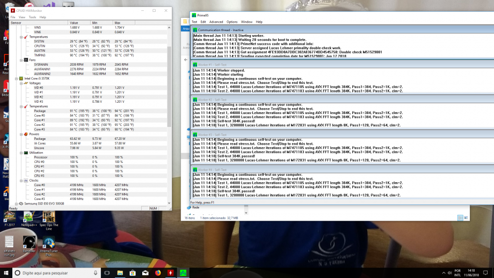 Boa tarde, pessoal. Fiz um over em meu i5 3570k, basicamente +0.005V e 4.2Ghz de clock base. Rodei o Torture Test do Prime95 e essas foram as temperaturas obtidas após 5 minutos de "tortura": Achei as temperaturas um pouco altas, mas pesquisei na internet e vi que o torture test do Prime95 é algo meio utópico, que eu não deveria me preocupar tanto, então gostaria da opinião do pessoal mais experiente. Logo após o término do teste as temperaturas baixaram bastante e bem rápido: Será que fica tranquilo eu manter essas configurações? Specs completas: Core i5-3570k @4.2Ghz Cooler Hyper T4 Cooler Master, com pasta térmica AS Ceramique 2 Mobo Asrock z77 extreme4 32Gb Hyperx @ 1666 GTX 1070 Galax Exoc (sem OC) Gabinete Java com 1 fan frontal, 1 fan lateral e um traseiro superior.