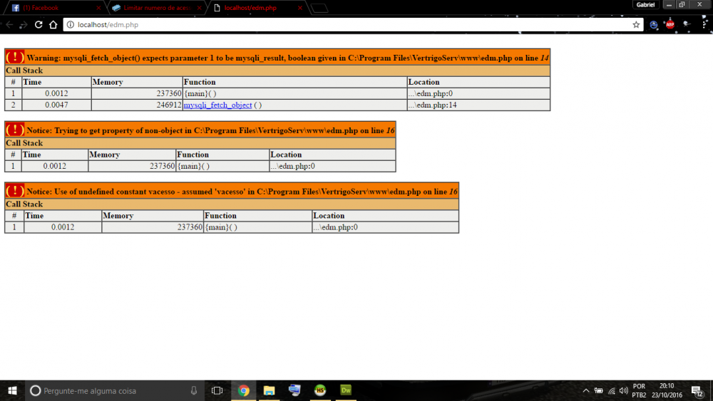 @DiF edm.php <?php include "Connections/conexao.php"; $confereLimite = mysqli_query($conexao ,"Select vacessos from usuarios where idusu = 4"); //Põe os dados em um objeto $usuario = mysqli_fetch_object($confereLimite); $qtdAcessos = $usuario->vacessos; if($qtdAcessos < 5): //Incrementa a quantidade. é a mesma coisa que $qtdAcessos = $qtdAcessos + 1 $qtdAcessos++; $atualiza = mysqli_query($conexao ,"UPDATE usuarios SET vacessos = $qtdAcessos where idusu = 4"); //Confere se o SQL de atualização foi realizado if($atualiza): echo "É a sua $qtdAcessos visita"; endif; else: echo "Você estourou o limite de visitas"; endif; ?> conexao.php <?php error_reporting (E_ALL & ~ E_NOTICE & ~ E_DEPRECATED); # FileName="Connection_php_mysql.htm" # Type="MYSQL" # HTTP="true" $hostname_conexao = "localhost"; $database_conexao = "edm"; $username_conexao = "root"; $password_conexao = "vertrigo"; $conexao = mysql_pconnect($hostname_conexao, $username_conexao, $password_conexao) or trigger_error(mysql_error(),E_USER_ERROR); ?> -
