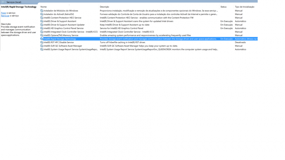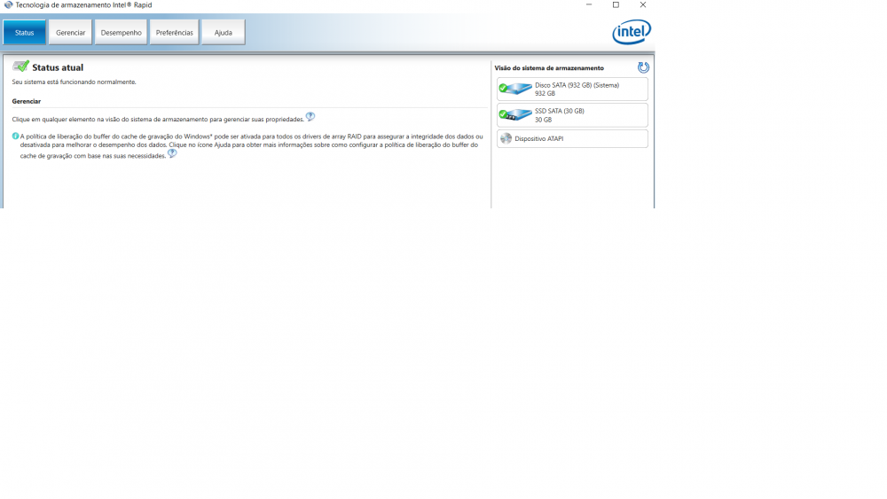 Tenho um Dell - Vostro 3560 do ano de 2013, que veio de fábrica com o SSD de 32 GB, realizando a função de chace e assim acelerando o meu sistema. Ele veio com o W8 pro e com o tempo, atualizei o mesmo para o w10 pro, até aí tudo bem, o programa - Tecnologia de Armazenamento Intel Rapid, funcionava ok. Porém após muito tempo, para ser mais exato, no final do mês de junho, o meu w10, devido um pacote de atualizações, simplesmente ficou corrompido, apagando todos os meus pontos de restauração. Mas eu tinha uma ISO do sistema, fiz a recuperação por ela, e mais uma vez atualizou e deu o mesmo problema. Decidi então, formatar o meu notebook, realizei todos os procedimentos como manda o fabricante (vídeos e documentos antigos que datam de 2013 até 2016 no máximo, sem atualização alguma), mas dessa vez, não estou conseguindo acelerar o meu sistema, pois quando entro no programa - Tecnologia de Armazenamento Intel Rapid, lá mesmo me indica que o sistema está funcionando corretamente (quando digito o comando no menu - Executar - "services.msc" e procuro pelo programa (está dizendo - Em execução - Automático (Atraso na Inicialização), não está disponível o procedimento para acelerar o sistema. O windows reconhece o meu SSD no gerenciador de discos, e quando digito o comando "listdisk" ele também aparece. Gostaria de uma ajuda se possível, pois a fabricante não ajuda em nada, já que o notebook, não está mais na garantia devido ao tempo e nem pagando para eles (realizando uma solicitação remota que os mesmo cobram bem caro) eles me atenderam. Sei que o procedimento em si não é dos mais problemáticos, mas não sou um usuário avançado, nem tão pouco intermediário, mas consigo entender e realizar alguns procedimentos e esse, infelizmente não consigo e nem achei a solução, pois todos os vídeos falam a mesma coisa.