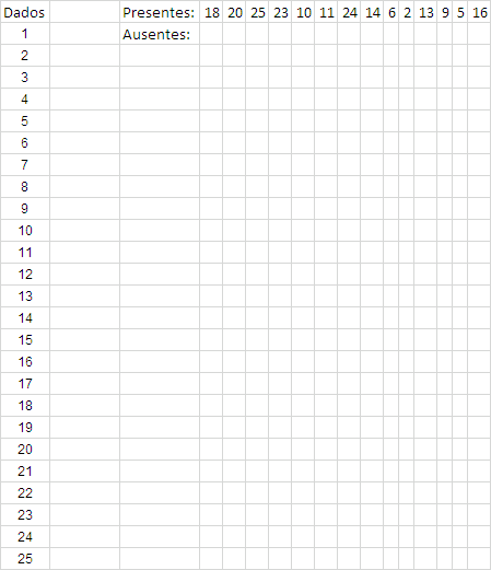 Ola prezados estou com uma duvida, tentei algumas formulas mais não esta dando certo ! como exemplo abaixo, tenho um uma sala com 25 numeros que quando eu compretar os 15 presentes ela ja me informe os ausentes .