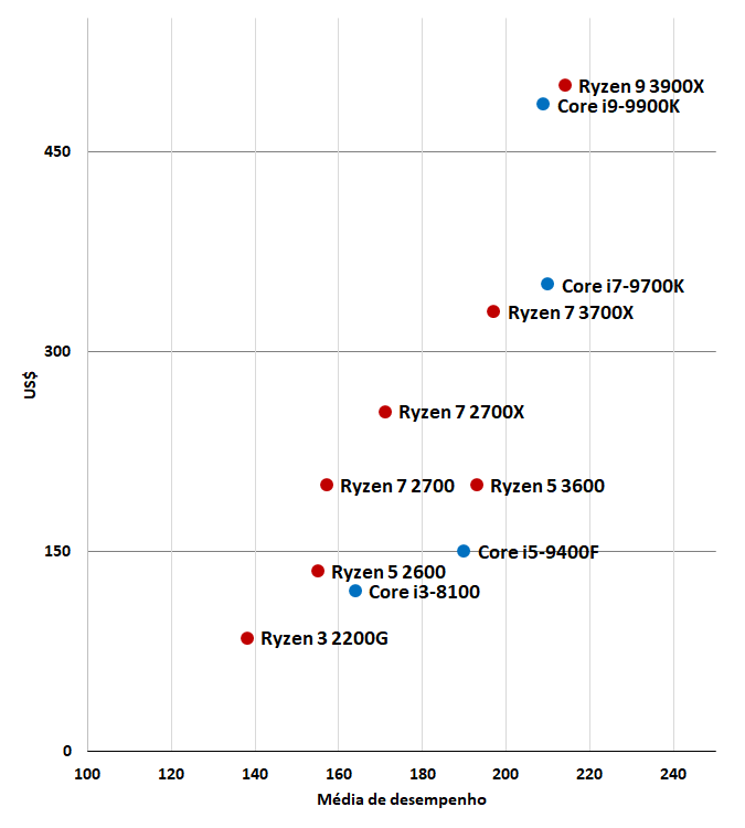 Para fins de melhor visualização precisei desconsiderar os processadores Core i9-9980XE e Core i9-7900X, pois em função da sua disparidade de preço o gráfico ficaria ilegível.