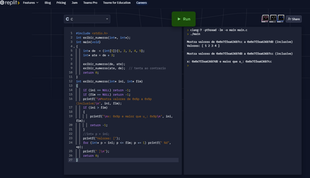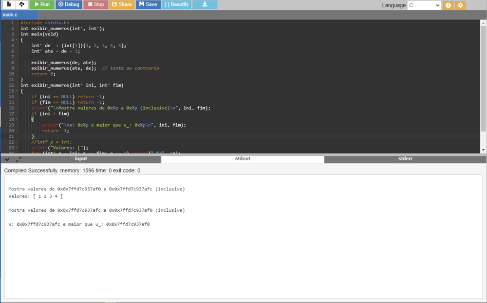 Então diga qual a versão que gostaria de ter visto, certamente não aquele que usou no programa abaixo (de tua autoria): int main(void) { int* de = (int[5]){1, 2, 3, 4, 5}; int* ate = de + 3; exibir_numeros(de, ate); exibir_numeros(ate, de); // tenta ao contrario return 0; } int exibir_numeros(int* ini, int* fim) { if (ini == NULL) return -1; if (fim == NULL) return -1; printf("\nMostra valores de 0x%p a 0x%p (inclusive)\n", ini, fim); if (ini > fim) { printf("\nx: 0x%p e maior que u_: 0x%p\n", ini, fim); return -1; } int* p = ini; printf("Valores: ["); for (int* p = ini; p <= fim; p += 1) printf(" %d", *p); printf(" ]\n"); return 0; } A saída tem "0x0x..." porque a string de formato tem um padrão fora do especificador! Qual o compilador que gera programas sem esse padrão para justificar eles na printf? Então (eu penso que) não pode ou nem sequer deveria tentar, já que é inútil e perigoso. Olhe! Eu sinceramente desisto, não é possível entender seus comentários. — Eu agradeço! Agora sei, entendi... tudo faz muito sentido. Tks! Obrigado!
