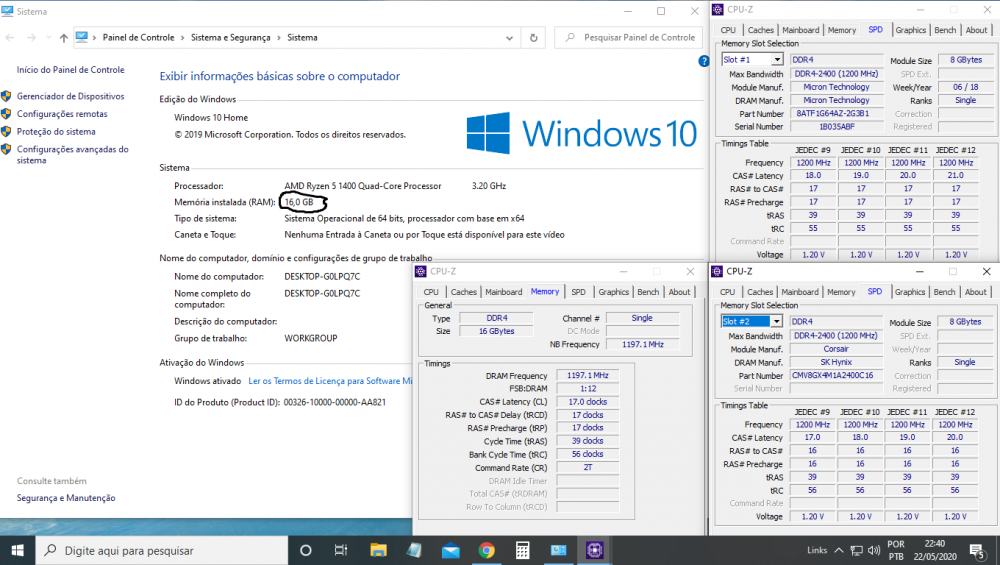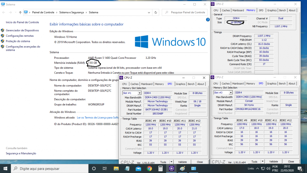 Boa noite amigos! Essa semana fiz o upgrade de memória no meu PC, com intuito de otimizar a performance nos jogos que estavam travando demais. O problema é que o sistema não reconhece as memórias quando colocadas em Dual Channel apesar da BIOS e do CPUZ reconhecerem, mas se coloco os pentes em posição de single channel, o sistema reconhece perfeitamente. Não sei mais o que fazer, deixo aqui minha configuração e as memórias em questão: Gygabite AB 350m-D3h-CF Ryzen 5 1400 Galax GTX 1060 6Gb Crucial 8gb 2400Mhz Corsair Value Select 8gb 2400Mhz Abaixo mostro a vocês como o sistema fica quando coloco os pentes nos slots correspondentes de dual channel: E aqui como o sistema reconhece perfeitamente quando coloco os pentes em cores diferentes na placa-mãe, em posição de single channel: Todas as tentativas de solucionar sem sucesso que realizei: Teste das memórias isoladas e juntas no Memtest86 - 0 erros nas memórias Clear CMOS Atualização da Bios para versão mais recente (inclusive antes da atualização da BIOS aparecia 16gb instalados e 7,93 disponível para uso, só depois da atualização da bios ficou só a informação de 7,93 instalados) Troca dos pentes entre os slots 1,3 e 2,4 invertendo os pentes das posições A única coisa que pensei poder ser o motivo é a latencia diferente dos pentes (o da Crucial é 17 e o da Kingston 16), mas em todo material que estudei antes de fazer a compra diziam que o sistema auto-regularia a latência para a maior afim de equilibrar as memórias, mas como podem ver no print, quando coloco as memórias em dual channel, o CPUZ aponta a latência como 16, quando o correto seria ficar em 17, pois é a maior latência entre as 2 memórias, será que é esse o problema? Enfim, não sei mais o que fazer e ficaria grato se alguém me ajudasse a solucionar esse problema, me perdoem o longo texto, mas quis informar tudo que já havia realizado, obrigado desde já a quem puder se propor a solucionar.