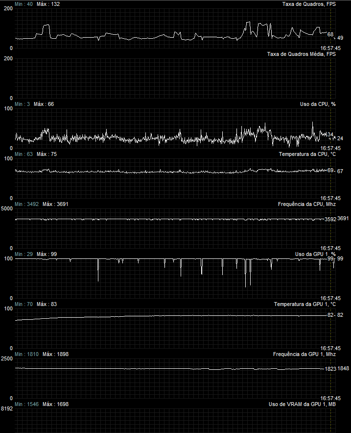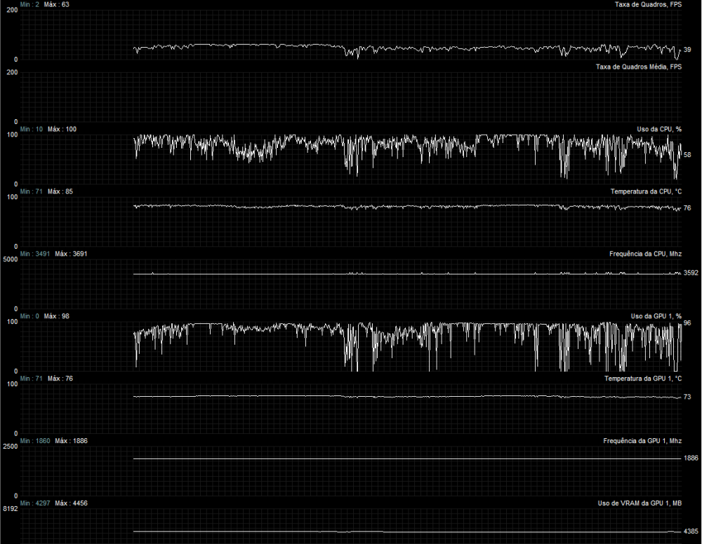 Fiz dois testes de benchmark, um com o Heaven Benchmark e o outro com o benchmark do GTA V, ambos com as configurações mais altas o possível. Monitorei os componentes com o MSI afterburner.