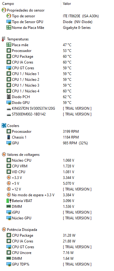 Também verifiquei os componentes pelo AIDA64, realizarei testes de stress também durante essa semana.