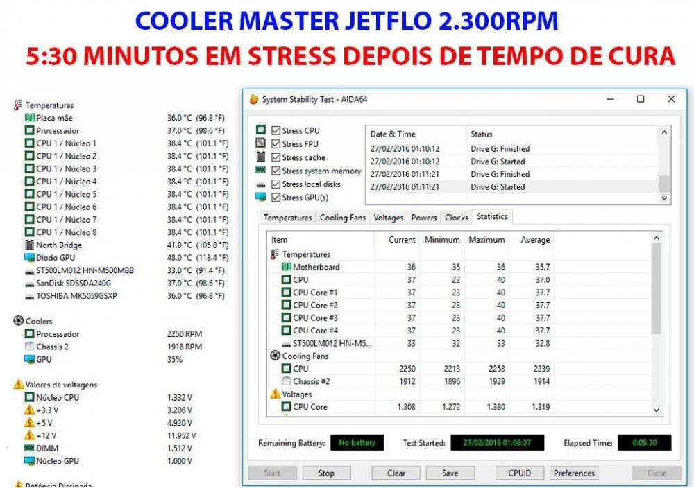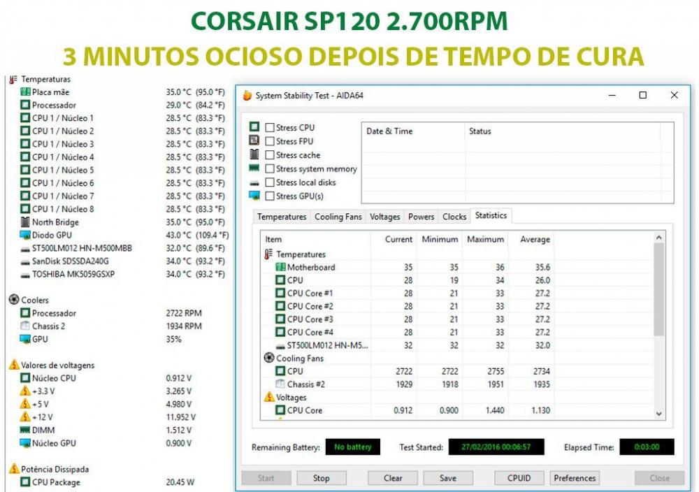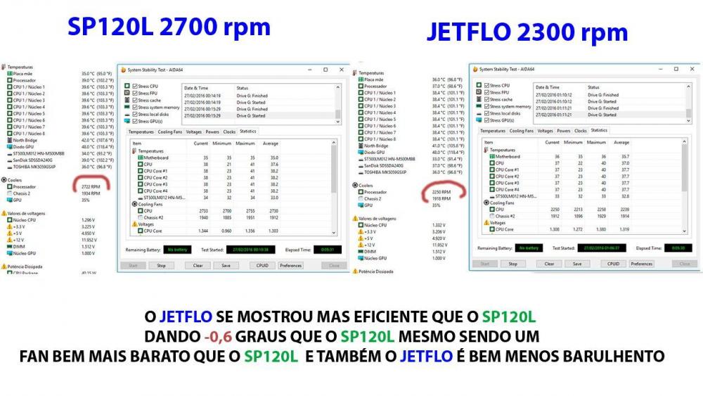 Boa noite Pessoal, recentemente resolvi realizar alguns testes de comparação de FANS, segue testes: COOLER MASTER JETFLO 2.300RPM vs CORSAIR SP120 2.700RPM Comparativo feito em WATER COOLER CORSAIR H100i GTX e PC COM CONFIGS DA ASSINATURA ABAIXO. *Substituindo os FANS CORSAIR SP120 por CM JETFLO em anexo os testes feito TIPO DE TESTES: OCIOSO VS OCIOSO, STRESS VS STRESS. Resultado: O JETFLO MESMO SENDO UM FAN MENOS FAMOSO, MUUUITO MAIS BARATO E COM MENOS "ESPECIFICAÇÕES" DE PERFORMANCE LIGEIRAMENTE SUPERIOR AO CORSAIR SP120. Conclusão: Compre FANS CM JETFLO, não pague o triplo em um CORSAIR SP120 para ter os mesmos resultados. Na questão de ruido os dois se equiparam. -