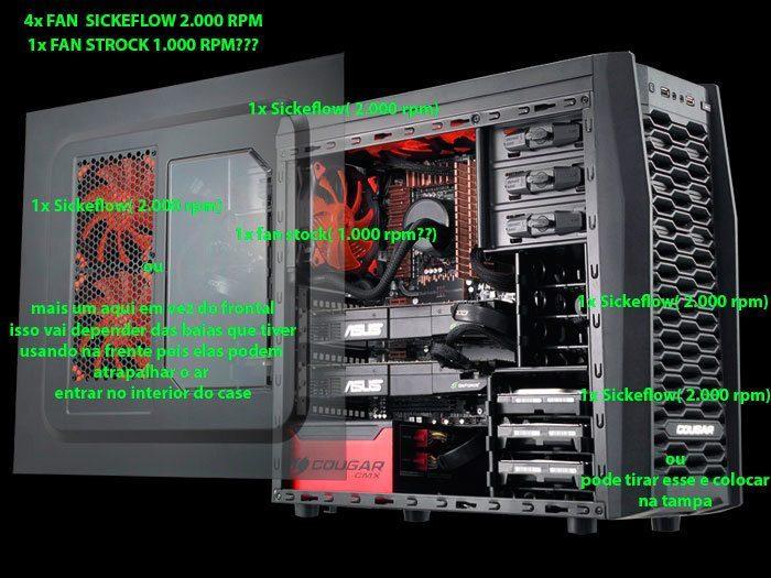 @Ryhuo Olá amigo, é bom colocar fans no frontal sim, pelo menos 2 FANS para "jogar" ar frio pra dentro e 1 atras para tirar. realizando testes na minha maquina desativando todos os fans menos do water cooler tive um aumento de temp de um modo geral(7ºC Cpu,3ºC mobo,4º C hds,12ºC Vga) O melhor a se fazer é testes, recentemente comprei um Watercooler Corsair H100i GTX que vem com dois fans SP120L de 2700rpm e 4.62 de pressão de ar...... de impressionantes de espeficações mas tirei eles e coloquei dois JETFLO 2300rpm e 2.72 de pressão. Queria compartilhar o resultado ai do anexo onde se ve pouca diferença mas o JETFLO é o minimo melhor que o SP120L mesmo sendo um FAN bem mais barato: -