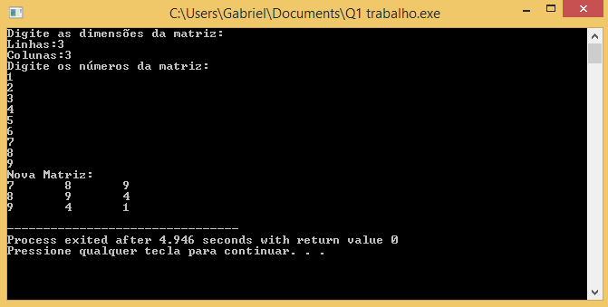 8. Eu pensei assim, mas tem erro main () #include<stdio.h> #include<stdlib.h> { int m[x][y]; int x,y,i,j,aux,cont=0; for(i=0;i<x;i++){ for(j=0;j<y;j++){ m[j] = cont++; } } for(i=0;i<x;i++){ for(j=0;j<y;j++){ printf("%d\t ",m[j]); } printf("\n\n"); } printf("\n\n\n\t linha Trocada\n"); for(j=0;j<x;j++){ aux = m[0][j]; m[0][j] = m[x][j];// m[x][j] = aux; } for(i=0;i<x;i++){ for(j=0;j<y;j++){ printf("%d\t ",m[j]); } printf("\n\n"); } }