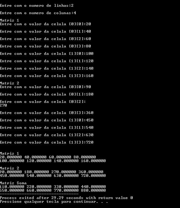 1. O programa que fiz é para somar duas matrizes, exibir a matriz soma, e as duas matrizes envolvidas na soma. Porém, como faço para o programa ficar mais bonito ? Ta cheio de 0000 da casa decimal, e queria saber se tem mais algo para deixar mais agradável, e tem como eu mostrar somente o decimal,se tiver, para não ficar cheio de .0000?