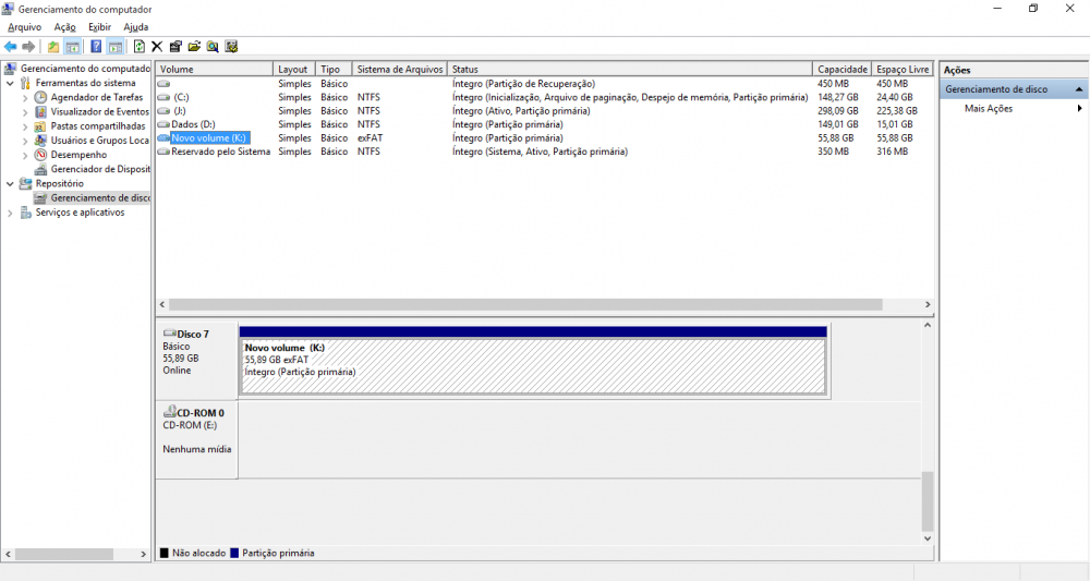 Eu tento Excluir o Volume e Recriar mas o Windows não reconhece o Espaço dele, tentei usar o gparted do Debian/Ubuntu Desktop 14.04 mas sem sucesso, percebe que o Formato está em exFAT mas antes de acontecido o problema ele estava neste formato e mesmo formando em outros formatos não consigo recuperar o Espaço Orginal.