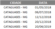 Bom dia, tarde ou noite pessoal! Estou precisando criar uma fórmula para encontrar a maior diferença entre as datas utilizando a condicional cidade Por exemplo: Precisava que minha formula utilizasse a condição da cidade, e retornasse a maior diferença encontrada entre duas datas, tipo um "recorde". Neste caso temos a maior diferença das datas de 20/12/2018 para 20/06/2019, que seriam 182 dias de diferença, preciso retornar exatamente esses 182 dias. Agradeço muito se alguém conseguir me ajudar, estou tentando usar uma fórmula pois quero evitar usar macro na planilha, mas se não houver nenhum jeito também é válido usar macro.