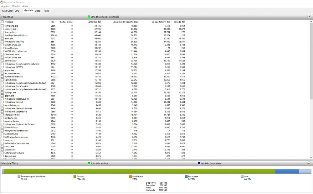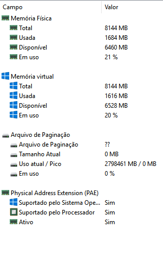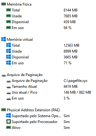 2. Galera, venho apresentando esse problema já algum tempo. Depois de alguns minutos com o PC ligado, ele começa a apresentar um alto consumo de RAM, e na verdade, não consigo identificar qual é o processo causador. Já usei com o Defender desligado e já testei 2 antivirus (kaspersky e avira) e continuou o mesmo problema. Minhas config. segue na imagem Aguardo instruções do que posso fazer para sanar o problema. Obrigado!