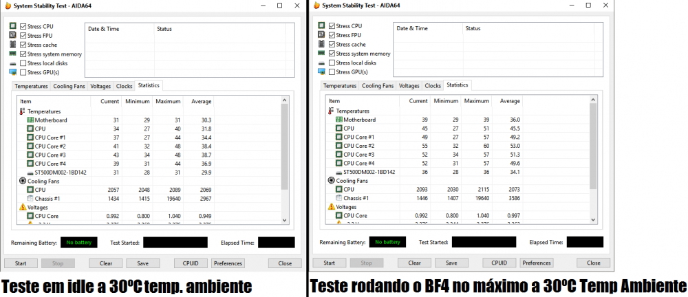 Bom, galera, como eu havia prometido, aqui estão os resultados do teste que fiz hoje. Comprei o Cooler Master Hyper T4, e coube certinho no gabinete, a instalação foi bem tranquila, gostei bastante do Cooler. Montei esse com a fan volta para a direção da placa de vídeo. Lembrando que não comprei ainda as fans que havia dito. Meu setup é: - MoBo: Asus P8Z77-M - Processador: Intel Pentium i5 3470, 3.2GHz - Memoria: 8GB (1x8) ddr3 1600MHz Kingston HyperX - GPU - MSI GTX960 2gb Gabinete Corsair Spec 02 - Com duas fans stock. Lembrando que o teste feito hoje, a temperatura ambiente está entre 30ºC e 33ºC, bem diferente dos 21ºC do primeiro teste que fiz, então isso influencia um pouco no resultado. Comparado com as temperaturas em idle, não mudaram tanto, claro, a questão da temperatura do ambiente muda algumas coisas. Mas a temperatura enquanto eu rodava o BF4 deu uma queda significativa. Gostei bastante do resultado. Antes dele, a CPU passava dos 70ºC em dias quentes como hoje. Vou repetir o teste quando fizer um clima mais frio, e volto a postar se for o caso. Contudo, é isso ai gente. Muito obrigado pelas dicas e ajuda. -