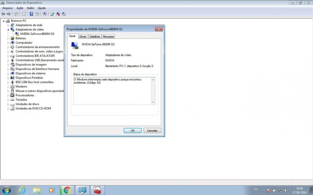 olá amigos , estou com um notebook aspire 5920g meio antiguinho xD . Eu o recuperei , não estava funcionando muito bem , mas dai eu o limpei e troquei o hd , ele estava guardado a muito tempo. Dai eu fiz a manuntenção nele e coloquei win 7 nele , instalei os drives tudo belezinha , mas eu percebi que mesmo eu instalando o driver maais atualizado da placa dele (geforce 8600m gs) o desempenho não melhora , e mostra que atualizei o driver , mas não roda nenhum jogo , sempre que abro algum game , pede pra atualizar o driver ,ou seja , o driver não funciona , não sei se é porque não tem mais suporte pra ele , mas não roda nada , nem minecraft. E ja fui no gerenciador de dispositivos e lá mostra um ponto de exclamação no ícone da placa, e nas propriedades fala o seguinte ...