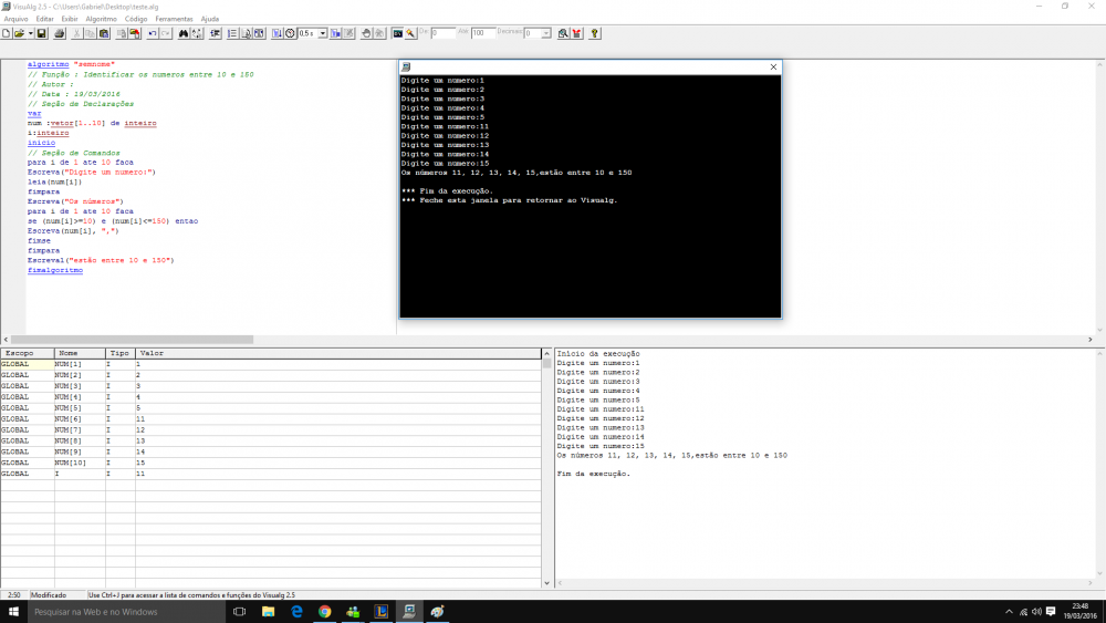 1. Sou iniciante no curso de ADS e montei o seguinte algoritmo hoje,após muitas pesquisas, no visualg. Eu queria saber como fazer para o ultimo número não ter a virgula de separação. Grato.