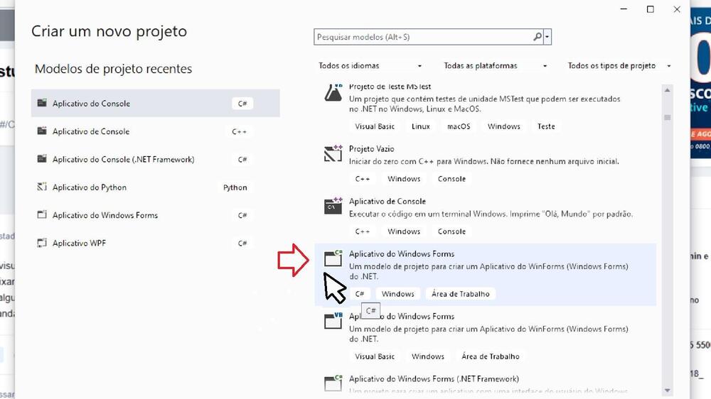 mas o que você se refere ? , quando você clicar na opção do windows Forms , o que vai aparecer é uma janela onde colocar o nome do projeto , e outra como essa e essa também