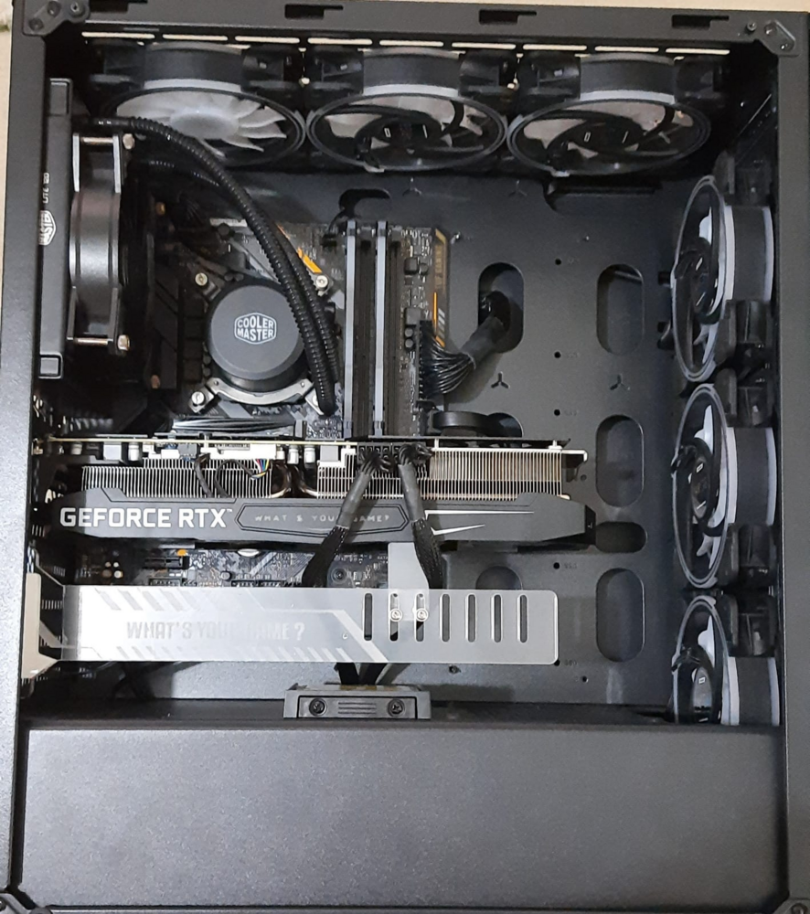 @Alex Weiss Segue desta forma, a fan de baixo do WC não tenho onde colocar, o esquema do Push and Pull não tem como colocar também, pois o gabinete usa uma telinha para evitar poeira e não há espaço. Esta fan acima do do conector da CPU não esta tirando nenhum ar quente. Qual WC você me recomenda? 280mm ou 360mm? Tem alguns que consigo por um bom preço. -