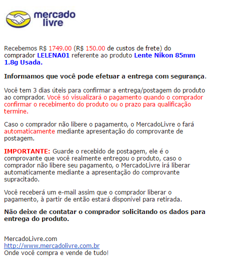 Tudo começou quando anunciei uma Lente de Câmera (Oclusiva) no Mercado Livre. Dentre as várias perguntas que os possíveis compradores me fizeram, uma delas veio de um rapaz da minha cidade, que me pediu uma forma de contato para falar comigo pessoalmente e ver o produto. Caso vocês não saibam, o ML proíbe que eu envie meu e-mail, telefone, Facebook ou qualquer outro dado pessoal pelo campo de Perguntas e Respostas do link da venda, mas mesmo assim eu enviei. Até entrei em contato com o cara e vi que ele era uma pessoa boa, porém, nesse ínterim, um golpista me enviou um e-mail: