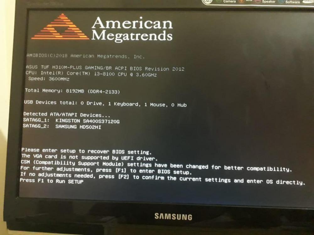 Comprei uma placa de vídeo ASUS Expedition GeForce® GTX 1050 Ti OC 4GB GDDR5 e não da nem video, já a placa de video antiga esta normal, já aualizei a bios da placa-mãe e aparentemente continua a mesma coisa, neste momento estou atualizando o win10 pois usava uma versao antiga, vou ver no que da mas alguem tem mais alguma dica??? minha config Processador Intel Core i3-8100 Coffee Lake 8a Geração Placa-mãe ASUS TUF H310M-PLUS GAMING/BR Memória HyperX FURY 8GB 2400Mhz Fonte EVGA 430W 80 PLUS WHITE